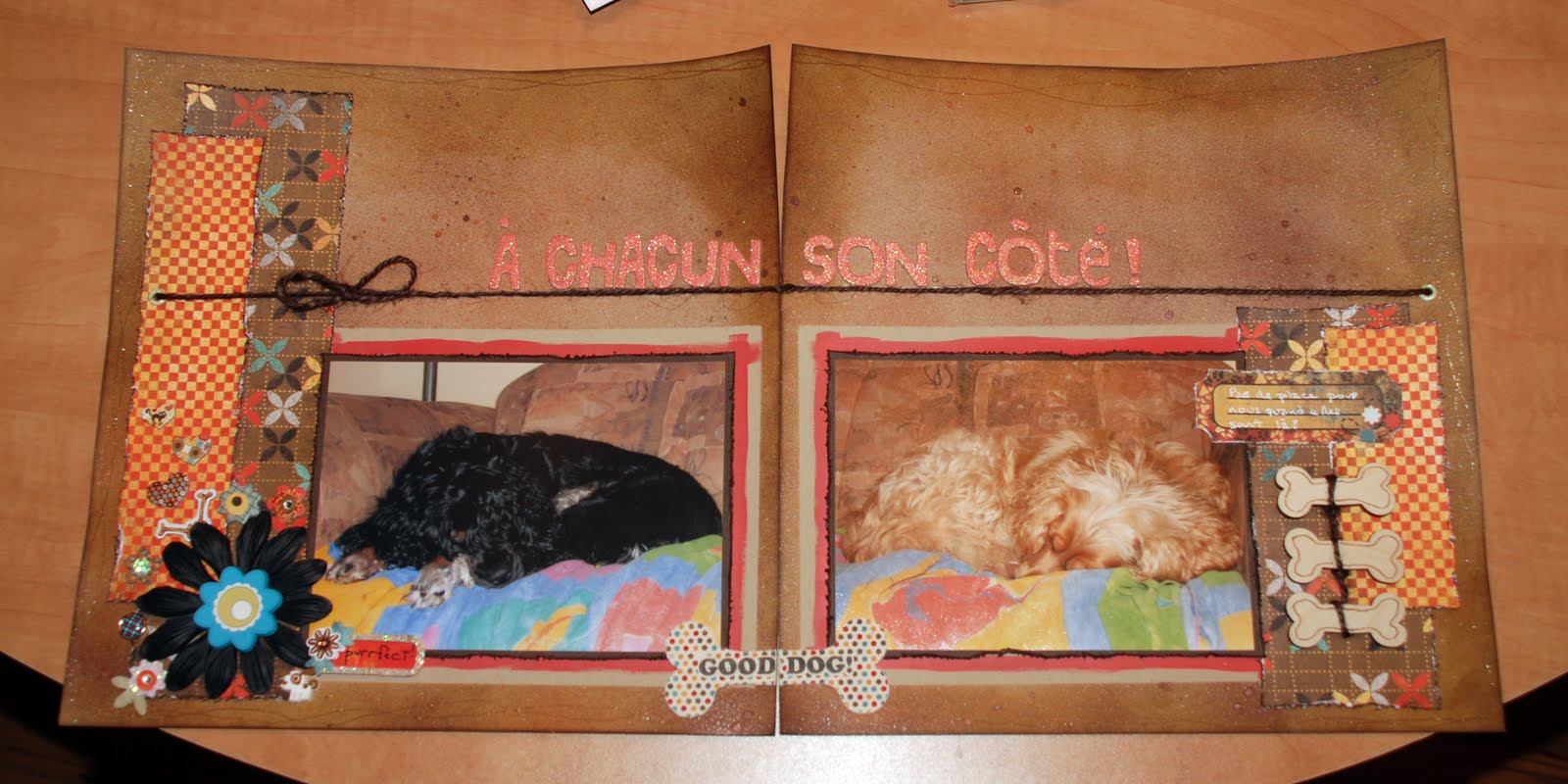 Alors voilà, je l'ai fait... Une page double, je pensais jamais que je réussirais a la faire. Définitivement c'est pas pour moi les pages doubles mais j'aime bien le résultat. Je ne voyais pas ses deux photos sur une même page, c'est pour cette raison que je me suis mise au défi d'en faire une page double!!! C'est encore une fois évidemment mes filles!!! Elles s'étaient endormies sur le divan et je les ai prise en photo. J'ai utilisé encore une fois la collection de papier Max and Whisker. Mon fond a été fait avec deux cartons Bazzill que j'ai encré avec de la distress de Tim Holtz puis ensuite glimmermister avec deux couleurs de Glimmer Mist, un brun et un orange.Je ne vous fait pas langir plus longtemps et je vous montre le résultat!!!